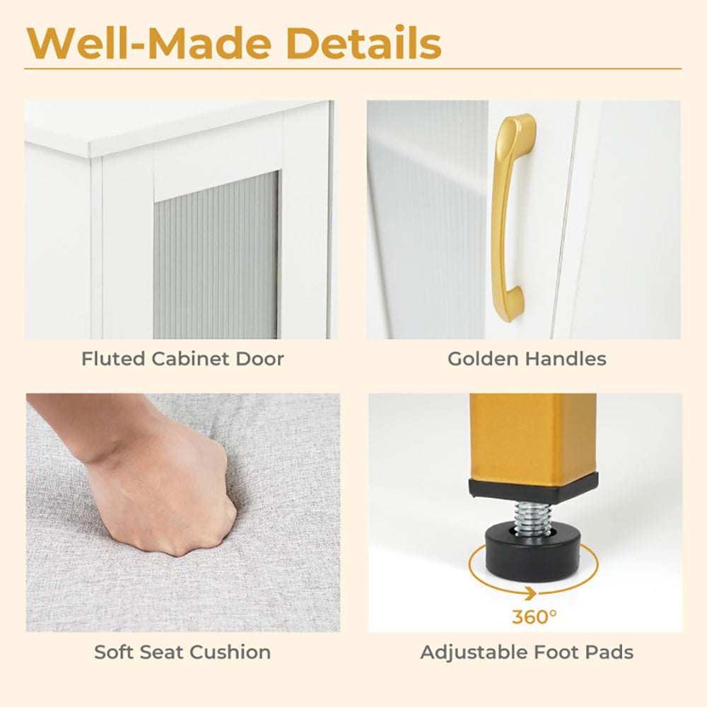 2 extra shelves, 2 open shelves, enclosed cabinet, and spacious desktop keep your space clutter-free. 2 fabric bags help you easily reach for your makeup tools. Plus, there is a 5-level adjustable shelf behind the door to suit items of different heights.